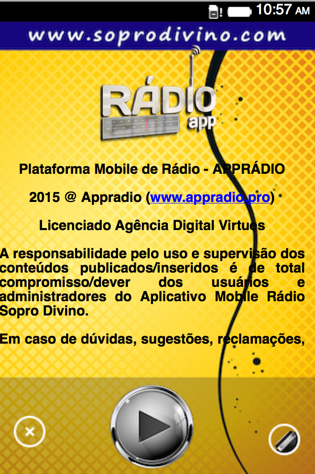 A Rádio Sopro Divino chega a plataforma iOS para abençoar os irmãos com iPhone, iPod e iPad. Ouça nossa rádio em qualquer lugar do mundo através do aplicativo, acesse nosso site e navegue dentro do aplicativo ouvindo nossa rádio. Os aplicativos APPRADIO V7.1 possuem um botão de sincronização com o servidor para os casos em que a rádio fica fora do ar ou qualquer outro problema dentro do aplicativo, ele busca corrigir através da sincronização. Para a navegação do site, o aplicativo possui funções próprias de navegação dentro dele. Também é possível controlar sua rádio através da Lock Screen. Não é necessário abrir o aplicativo para pausá-lo. Caso ele seja o último aplicativo utilizado com uso do recurso, é possível dar o play sem precisar abrí-lo também. Baixe o aplicativo e ajude-nos a crescer. Em caso de dúvidas envie e-mail para: [email protected].