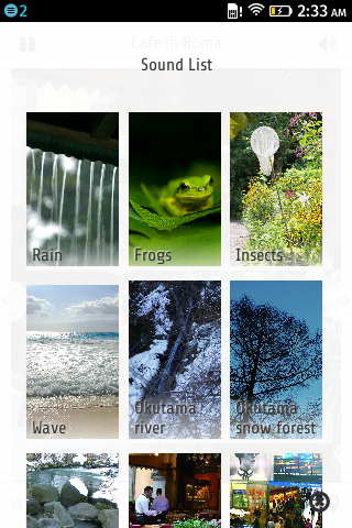 Relaxation sound player : Virtual Reality by binaural recorded environmental sound and your music. Concept of this app is below : - Lets you easily trip to a relaxation place. - ex. Reading books on the beach, forest, quiet cafeteria. - Listening to music at the relaxation place. - Working on back ground. - Multi-platform with HTML5 App specification is below : - High quality environmental sounds. - Selection of environmental sounds (forest, beach,rain). - Volume control of the environmental sound. Concept of user interface is below : - One tap relaxation. - Immerse users in the relaxation place.