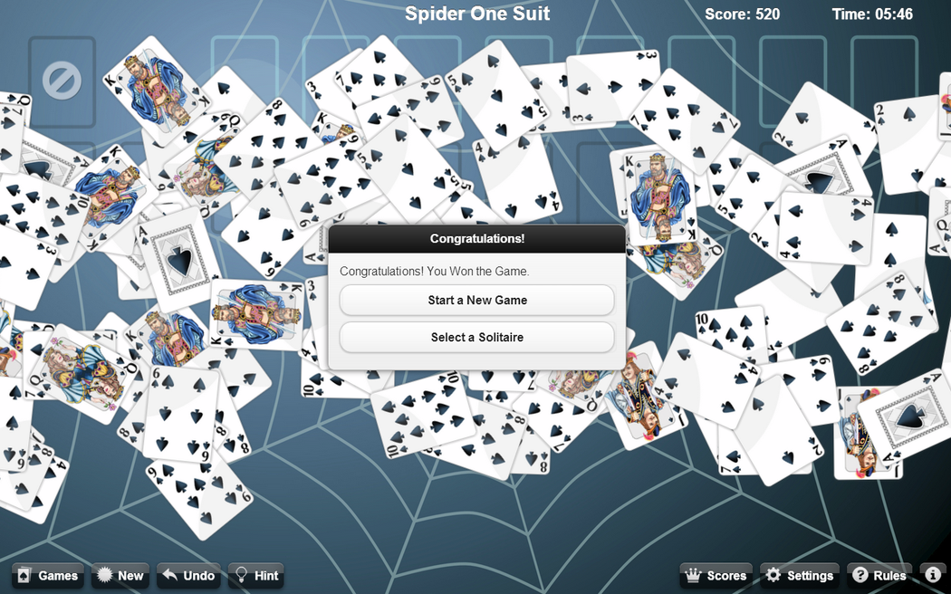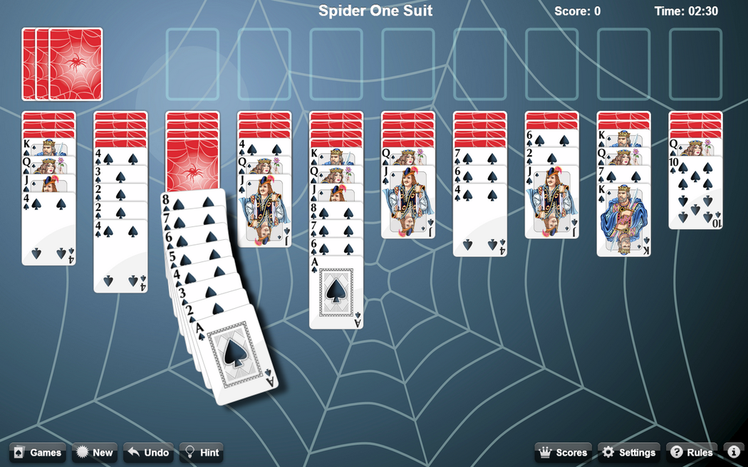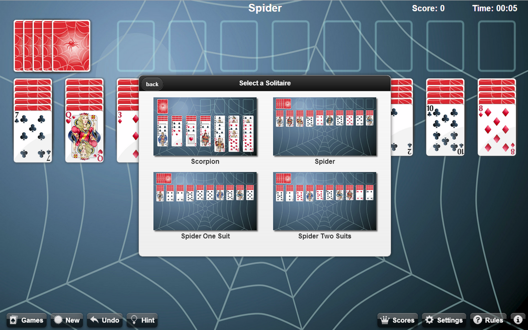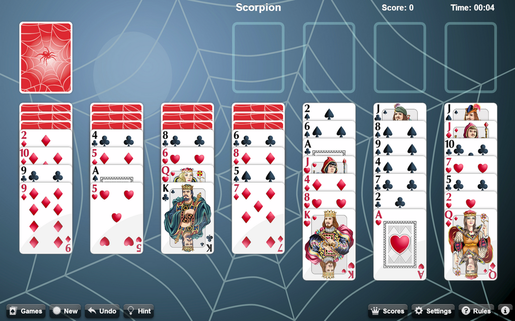 Play in your browser a beautiful and free Spider solitaire games collection! Spider Solitaire is a 100% free collection that allows you to play 4 challenge Spider Solitaire games: Spider Solitaire, Spider One Suit, Spider Two Suits, Scorpion. Spider Solitaire Features: - Smooth fluid and advanced animations - Many beautiful card sets, card backs and backgrounds to choose from - Automatic card flipping - Deal animation and winning animation - Single click to auto move cards - Unlimited undo and redo options - Statistics tracking - Hint function will suggest a move if you need help - Save game progress - and many more...