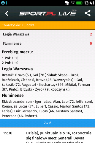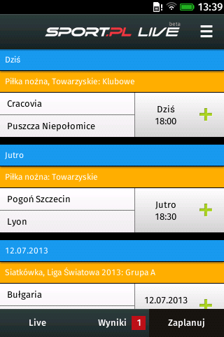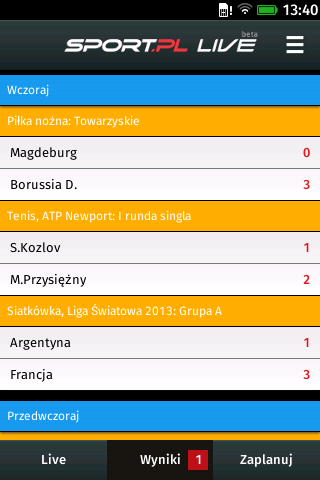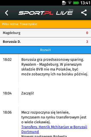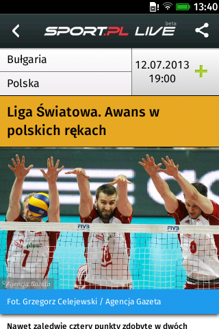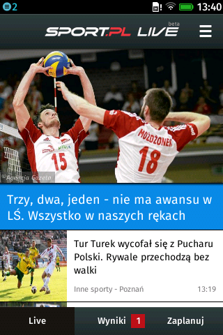 Sport.pl LIVE to transmisje na żywo z wydarzeń sportowych. Relacje na żywo online z takich dyscyplin jak piłka nożna, koszykówka, siatkówka, F1, żużel, kolarstwo. Sport na żywo w twoim smartfonie. Relacje na żywo, transmisje online meczów, wyniki na żywo, livescore, zdjęcia, terminarze zawodów, newsy i informacje. Sport.pl LIVE to: - Kilkaset relacji sportowych na żywo miesięcznie; - Błyskawiczny dostęp do wszystkich informacji Sport.pl; - Pełny terminarz wydarzeń sportowych z możliwością ustawiania przypomnień; - Wyniki na żywo, livescore. Sport.pl LIVE to transmisje i informacje: - piłka nożna (T-mobile Ekstraklasa, Liga Mistrzów UEFA, Premier League, Primera Division, Bundesliga, Borussia Dortmund, Barcelona, Real, Madryt, Robert Lewandowski, reprezentacja Polski) - F1 i rajdy samochodowe (Alonso, Vettel, Kubica, Małysz, Rajd Dakar, Rajd Polski) - tenis (Radwańska, Janowicz, Kubot, Australian Open) - koszykówka (Gortat, NBA, Lakers) - siatkówka (Wlazły, Kurek, Skra Bełchatów, ZAKSA) - żużel (Ekstraliga, Gollob) - skoki narciarskie (Stoch, Żyła, Turniej Czterech Skoczni, Zakopane, Wisła) - biegi narciarskie (Kowalczyk, Bjoergen, Johaug, Mistrzostwa Świata) - boks (Adamek, Wach, Kliczko)
