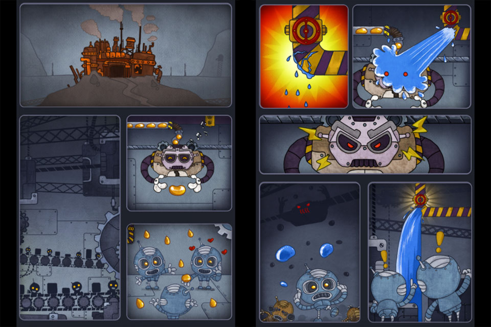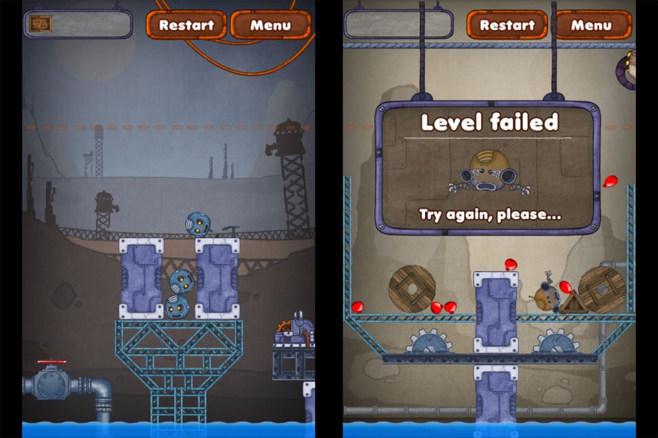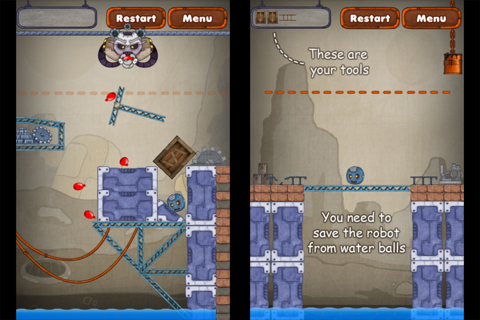 Once upon a time an awful thing happened in the land of robots. One bad example threw the drops of water on the inhabitants which resulting in rust and breakdown of vital robots' elements. This is how Steel Story begins. However, clever machines decided to hide behind the barricades of wheels, boxes and chests. You are to help! You have only 3 taps to shelter the robots or launch tricky mechanisms which can help them. Every millimeter counts when try to save these funny steel creatures - one wrong movement and they are defenseless. Be very careful in this Steel Story!