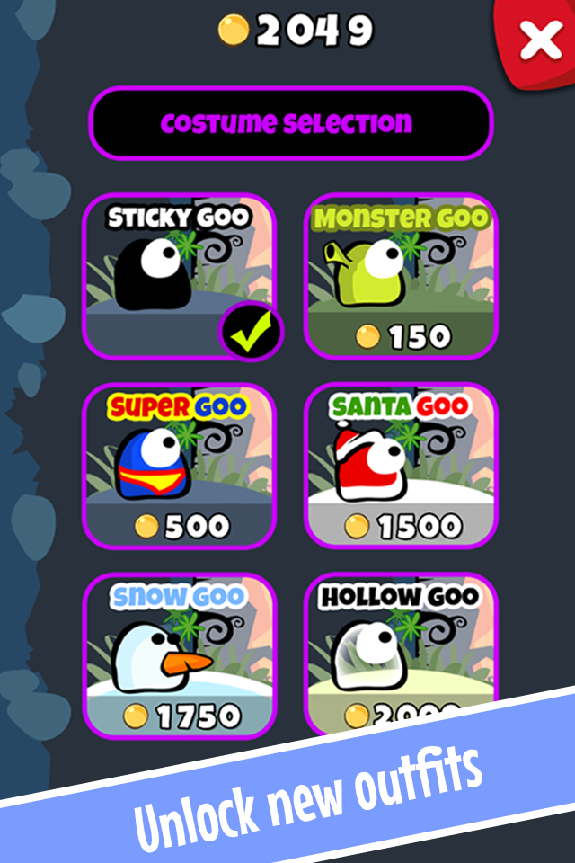 Meet Sticky Goo, a challenging and twisted vertical jumping game that will put your timing and precision skills to the test! Dangling spiders, narrow platforms, breakable rocks and other obstacles will leave no room for mistake as our little goo embarks on a quest of heroic proportions to save his love! Simple controls: • Tap = Bounce • Hold = Stick to walls (the longer you hold the higher you jump) • Alternatively use Arrows or A/D keys. It's all about timing! How high can you climb? Spice up your runs by collecting gold coins and unlock new goo outfits: • Super Goo • Monster Goo • Snow Goo • Santa Goo • Hollow Goo. We hope you enjoy this game and for any question or specific issue feel free to contact us via [email protected] - Your feedback is welcome!