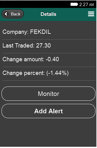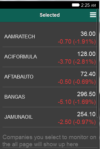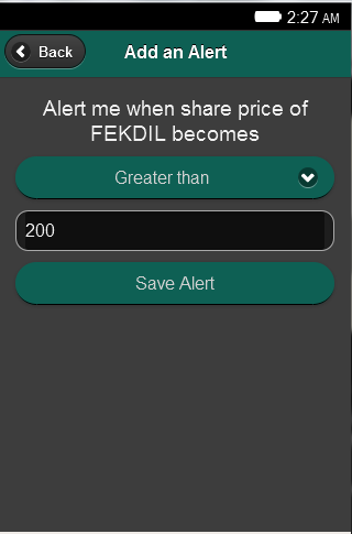 This app will let you access share price news of all companies in the Dhaka stock exchange in real time. It will also let you select some companies which will show up seperately on the home screen for ease of access. The app will also let you set news alerts so that you will be informed when a share price crosses a certain threshold set by you. For example, you could create an alert that will notify you when Grameenphone share prices become greater than 500 tk. The app updates information automatically every fifteen minutes and will alert you from the background.