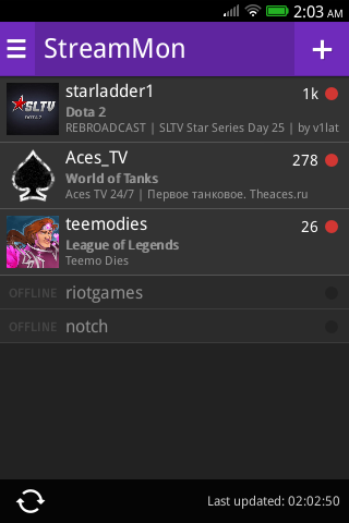 Keep up to date with Twitch live streams. See who's currently on line, and details of what they're playing. Requires internet connectivity. This application is in no way affiliated with Twitch.