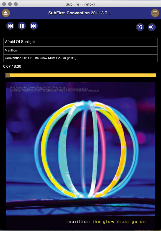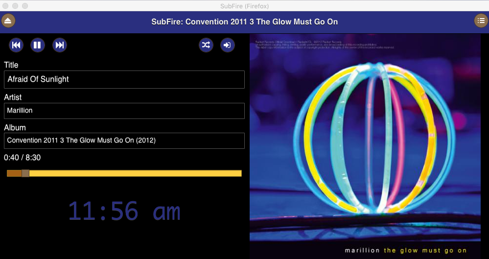 SubFire: HTML5 Audio player for the Subsonic Media Streamer. SubFire is a full-featured player for the Subsonic server, with playlists, folder browsing, artist browsing (id3), and album browsing. Features include multiple login configurations, album cover art, saving your current play queue, and more.