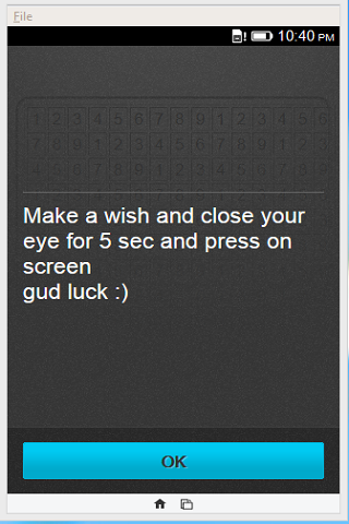 For prediction about your wish This is numerology based app which give you prediction about your wish . it give absolutely result only just follow the rule. make a wish by close eye and touch the screen result will be displayed regarding your wish .