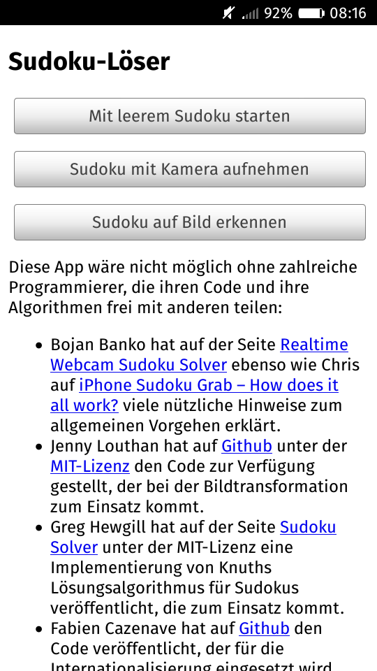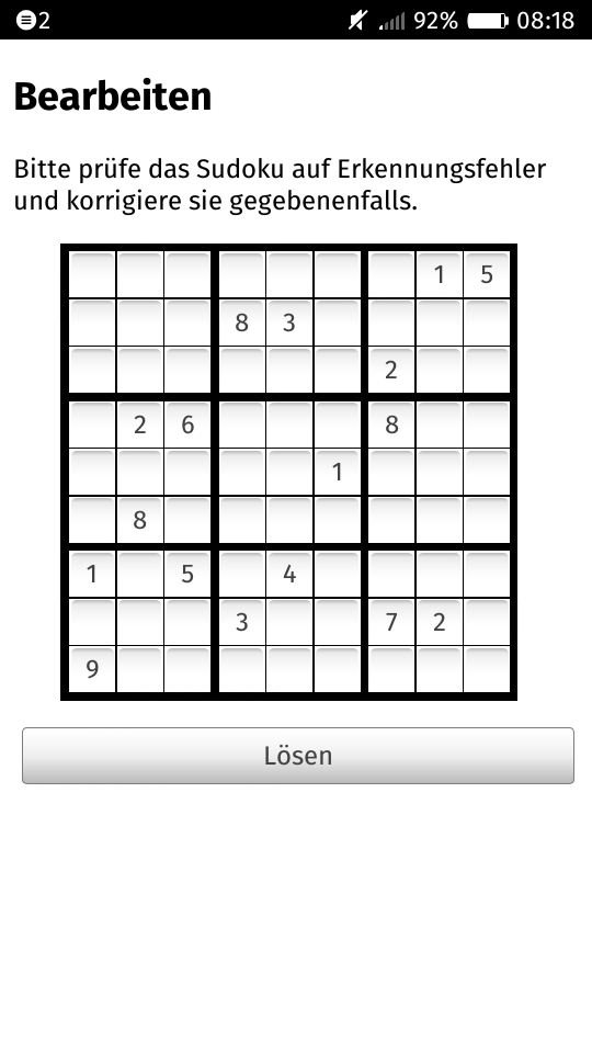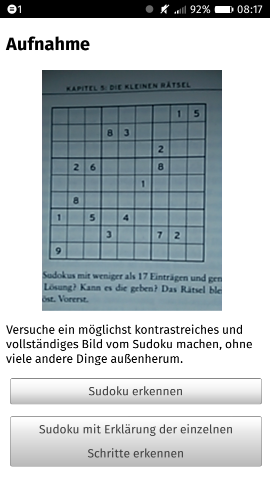 Install the latest version from GitHub! The version here on the Marketplace can no longer receive updates! This app recognizes and solves Sudokus. The recognition can work directly from the camera or from an image from the gallery. The recognition step can just show the result, or alternatively intermediate steps to show how the app works. Afterwards you can fix recognition errors manually (or alternatively enter the Sudoku without camera). Then the app will solve the Sudoku. The recognition isn't at all perfect, sometimes the result is astonishingly good, sometimes astonishingly bad. To get an image directly from the camera, Firefox OS 1.4 or above is required.