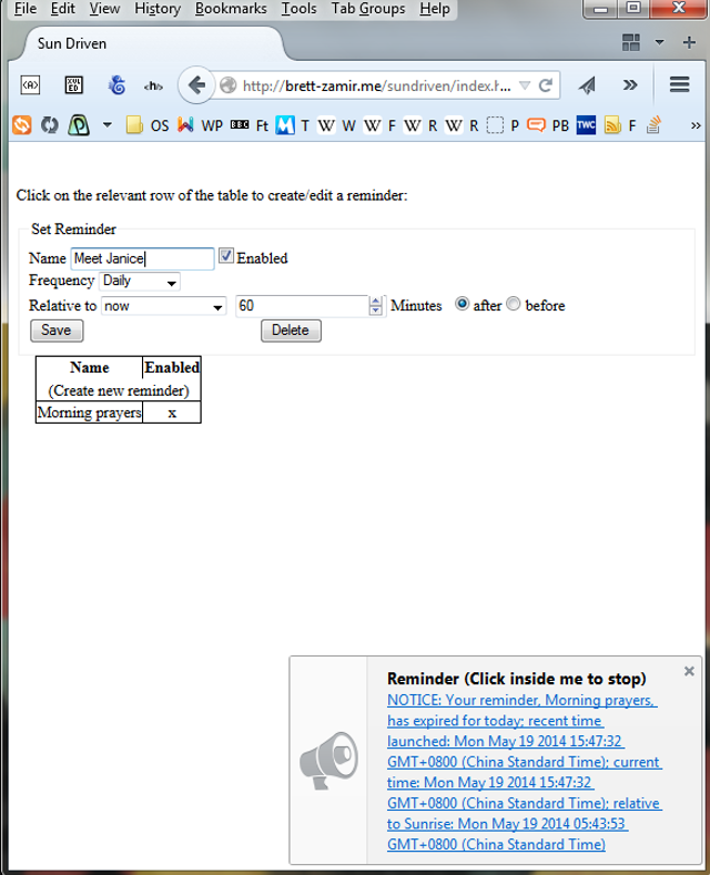 Very simple app to provide toaster-style notification reminders (daily or one-time) given relative to either the current time or to astronomical events such as dawn, sunrise, or sunset. Note that the astronomical event times are currently determined mathematically rather than by querying an online service.