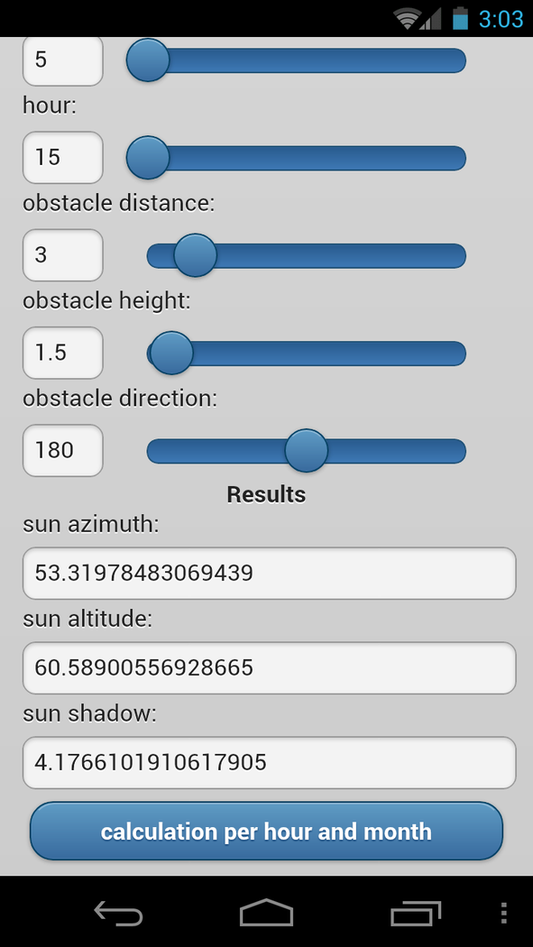 sunNshadow is a tool for calculating sun azimuth and altitude at any given time. It can also determine if a shadow is cast from a specified obstacle. SunNShadow This is a tool for calculating sun azimuth and altitude at any given time. It can also determine if a shadow is cast from a specified obstacle. Sun position In the beginning the latitude, longitude and current time are automatically set. Then by moving any slider or inputting any value, the results are presented in the appropriate fields. Shadow In the fields obstacle distance and height, the values for the obstacle are declared. In the “sun shadow” field the difference between the distance from the obstacle and the shadow length is calculated for the specified time. If the difference is < 0 then the shadow overlaps the calculation point. Batch shadow calculation By pressing the button "calculation per hour and month" the shadow is calculated for every hour and month. A list is printed for the times when the shadow reaches the calculation point.