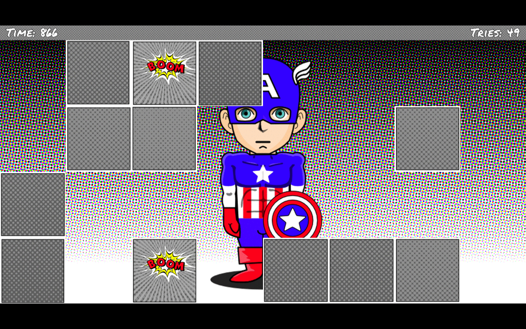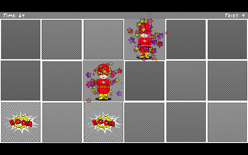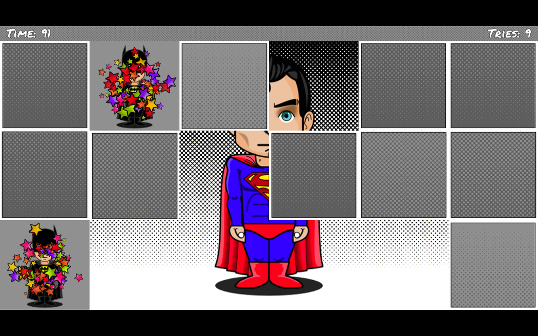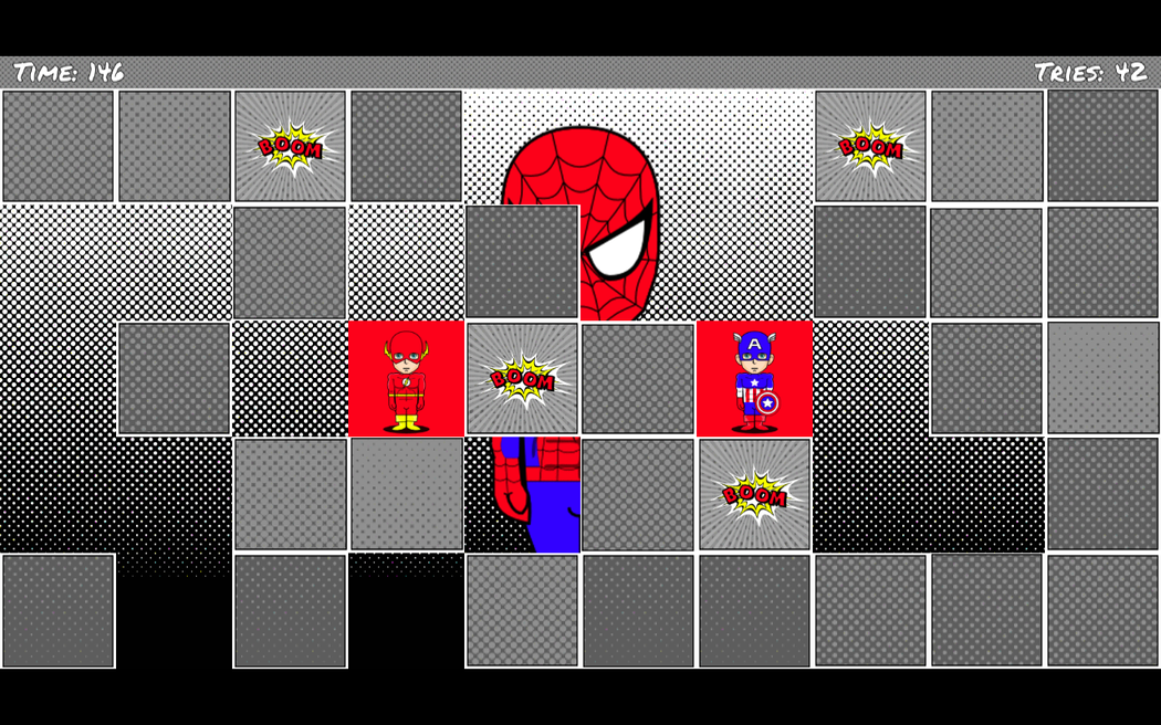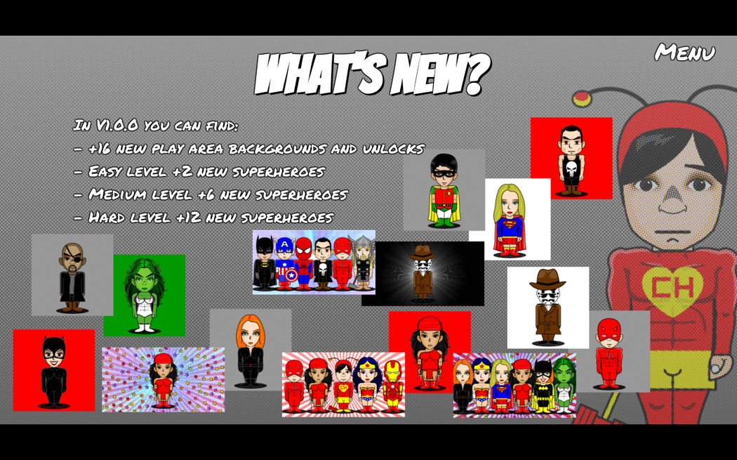The goal of the game is to find pairs of hidden images. What's new? In V1.0.0 you can find: - +16 new play area backgrounds and unlocks - Easy level +2 new superheroes - Medium level +6 new superheroes - Hard level +12 new superheroes When you point to a spot it shows the image hidden behind, then you can point a second place that will also be revealed. If both hidden images match then you get some points and the images are removed from the game revealing a background picture. If the images don't match then they hide again and you can continue searching for a matching pair. The more you can remember of your failed attempts the better. The images are based on different superheroes, please make sure that you match both superhero, background colour and any other image details.