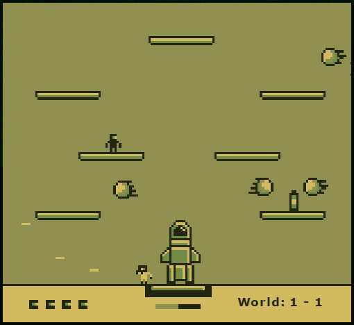 SuperJet, a skill-platform game like it was for GB. If you've known Jet Pac for the Spectrum, this is my vision of how a sequel to the game would be if developed for Gameboy. Enjoy! Controls: Left and right arrow keys: movements Space: Jump (and Start) Up arrow key: jump or enter door if standing in front of one. Enter: Start and Pause 360 GAMEPAD COMPATIBLE!! (analog or digital pad for movement and doors, A for jumping and Start for... well, for Start and Pause ;) Zoom mode: Clic inside the virtual console screen.