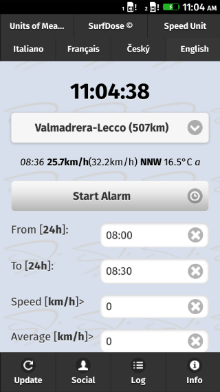 The Windsurfers/Kitesurfers Alarm Clock Are you a Windsurfer of Kiter? Do you wake up at 5am to check if wind is up in Valmadrera and your wife/girlfriend or husband/boyfriend is upset because also today you've woken her up for nothing? Or you just want to check the wind in Valma or Riva del Garda or any of the other available spots? SurfDoseAlert is for you! Setup the alarm clock time range, set minimal wind speed and start it! Alarm clock will ring only if chosen conditions are found! ATTENTION: APP MUST BE IN FOREGROUND WITH SCREEN ON AND NOT LOCKED. Available spots: COMO LAKE: - Valmadrera - Lecco - Cremia GARDA LAKE - Pra - Pier/Riva del Garda - Malcesine - Torbole LIGURIA - Albissola EMILIA ROMAGNA - Porto Corsini PUGLIA - Siponto (Manfredonia) SPAIN - Pozo izquierdo SWISS - Silvaplana Do you want your meteo station to be available in SurfDoseAlert? Let us know! Available in English, Italian, Czech, French, German, Spanish and in various speed units (mph, knots, m/s, km/h) “Advanced Options” (enabled by registering for free to http://www.surfdose.com, the Windsurf Statistics and Report Website): - Social function: tell your friends you are going to surf and check who you will find on the spot - View eventual webcam spot picture - Choice of different waking up methods (vibration, music, sound) - Possibility to enable/disable the “Smart Pause” (Alarm paused if device if face down) - Option to skip Alarm in case of Rain (if rain data available) REMARKS: SurfDoseAlert works ONLY if DEVICE is ON, UNLOCKED and with SCREEN ON, APP is RUNNING in FOREGROUND, VOLUME is adequate, and DATA CONNECTIVITY is on. Please test in advance your configuration. - On compatible devices, SurfDoseAlert can be paused by putting the device face down: the alarm clock will not ring (Advcanced Options only). - SurfDoseAlert has 'Advanced Options' available by registering for FREE to SurfDose, the website for Windsurf Reports and Statistics. Once registered, you can enable the advanced options by entering the same Username and Password. - SurfDoseAlert use DATA CONNECTIVITY to retrieve weather data. Consider it to avoid unforeseen costs with your mobile plan. - "Cam" option increases DATA usage. Consider it to avoid unforeseen costs with your mobile plan. - SurfDoseAlert might send to the developers some data useful to improve the application (like wind speed setup or time range). - Maximum attention has been put in developing this application. Anyway no guarantee, implicit or explicit, is provided about the performance or the access to weather data in future. Please feel free to contact us if you want to make data from your weather station available in SurfDoseAlert. Web Twitter Facebook Feedback