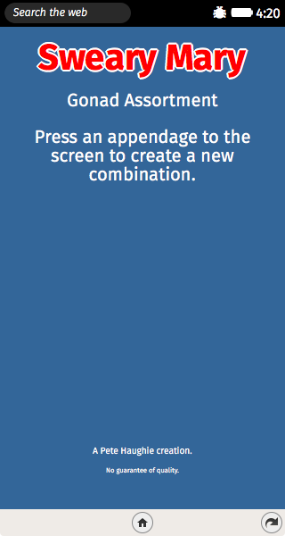 Have you ever fought desperately for a swear word in the heat of the moment but fallen just short? Well let Sweary Mary help you make the air blue. Sweary Mary is a Pete Haughie creation and therefore no guarantee of quality.