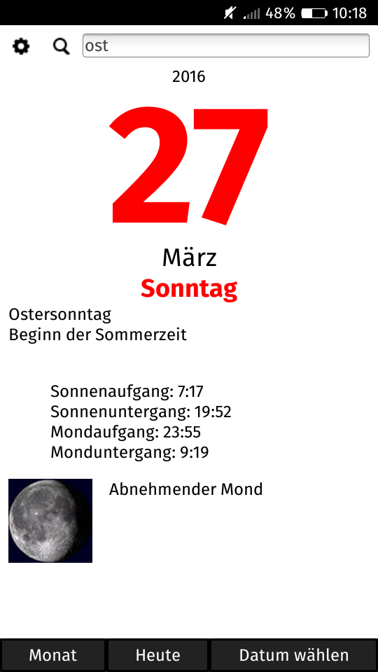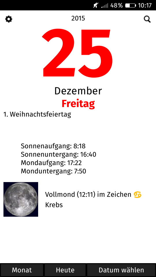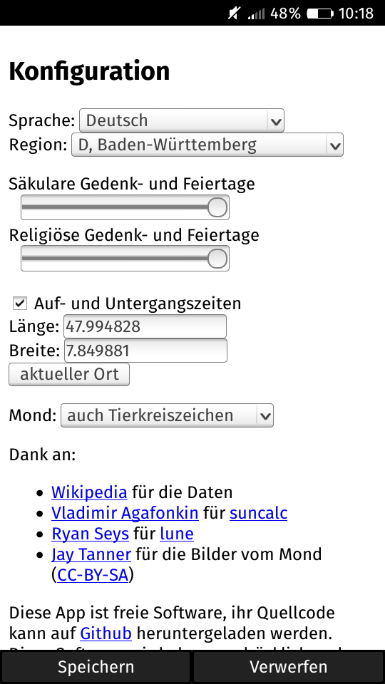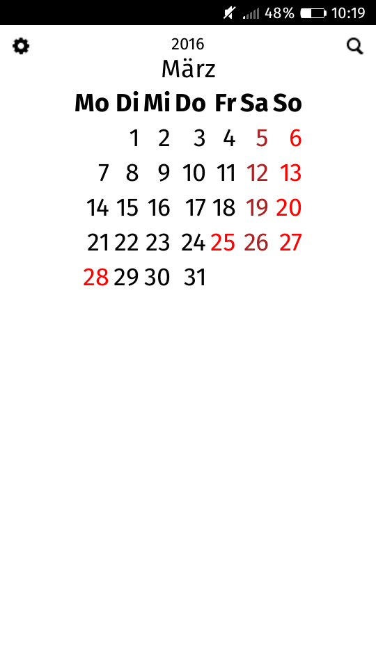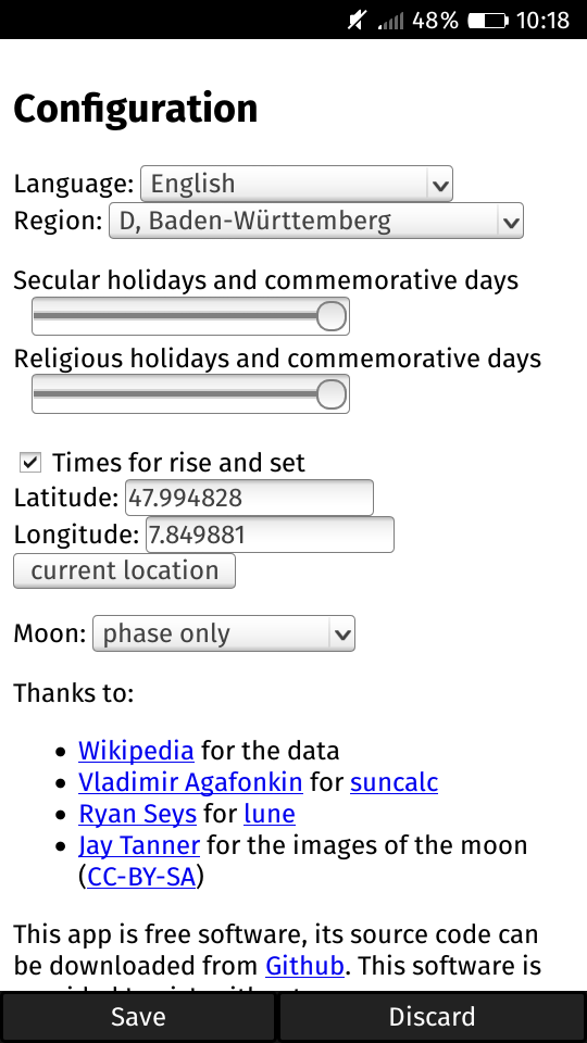 - Though holidays can be shown for any country, currently there are only data for Germany (and to some degree Switzerland, Liechtenstein and Austria). If you want to use this app in another country, just write me an email.