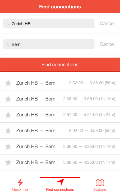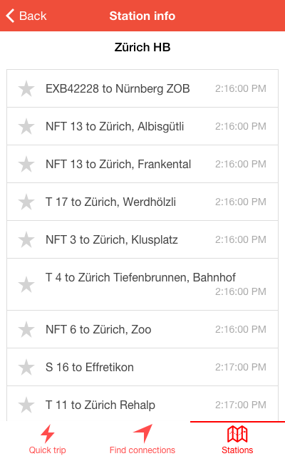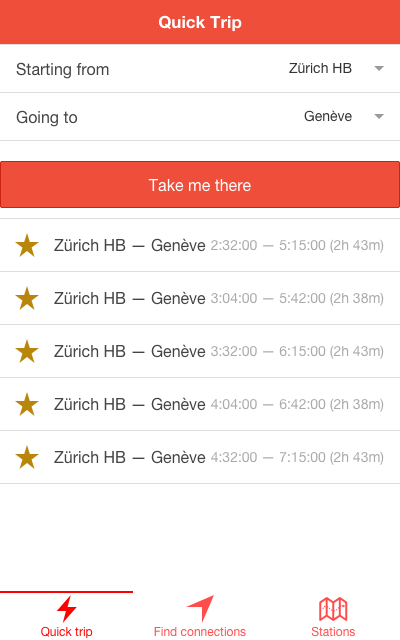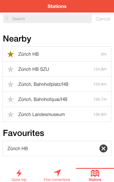 Swiss public transport - quick & easy! * Quickly find connections from your current position * Save connections to view them offline * Bookmark stations for even quicker connection search * Find nearby stations * Bookmark connections to see them offline, too * Stationboards with upcoming departures