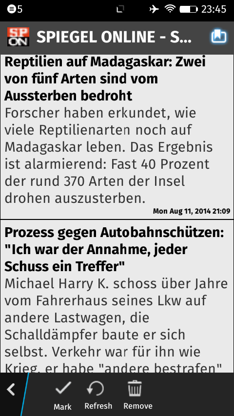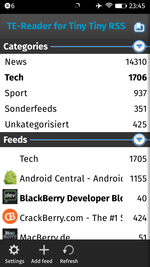 TE-Reader for Tiny Tiny RSS YOU NEED ACCESS TO AN INSTANCE OF TINY TINY RSS TO USE THIS APP! TE-Reader is an app to read news feeds from a TinyTiny RSS instance on your device. Share interresting articles, mark them as read/unread, "publish" and "star" them. Or simply add new feeds to your server installation. Share interesting articles via FirefoxOS share options. "Tiny Tiny RSS is an open source web-based news feed (RSS/Atom) aggregator, designed to allow you to read news from any location, while feeling as close to a real desktop application as possible." Get it from: http://tt-rss.org TE-Reader was developed by Marcel Meissel and Henk Jonas. It wouldn't have been possible without the contribution of Henk Jonas. Thanks Henk for your assistance and work!
