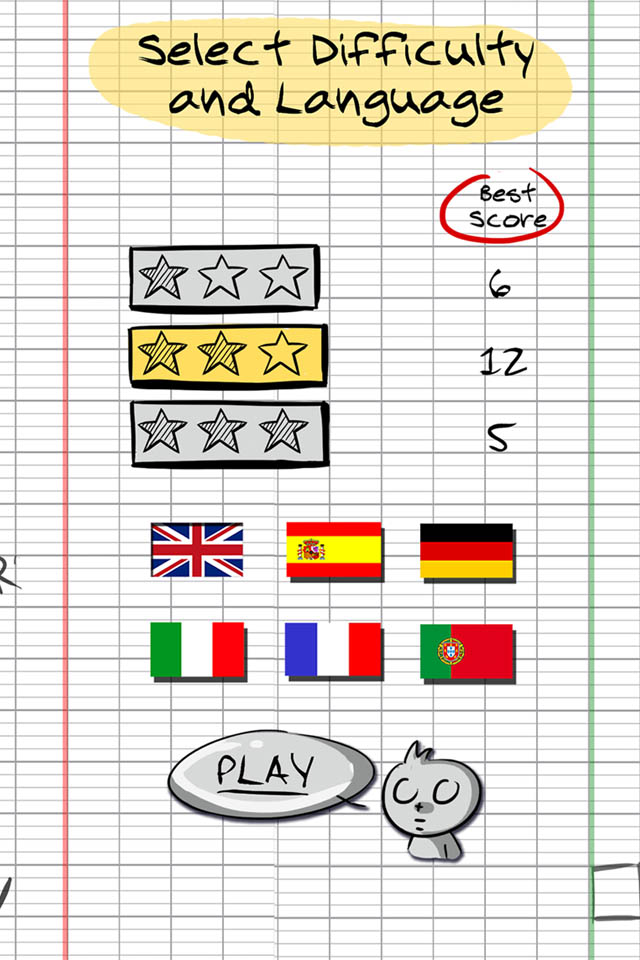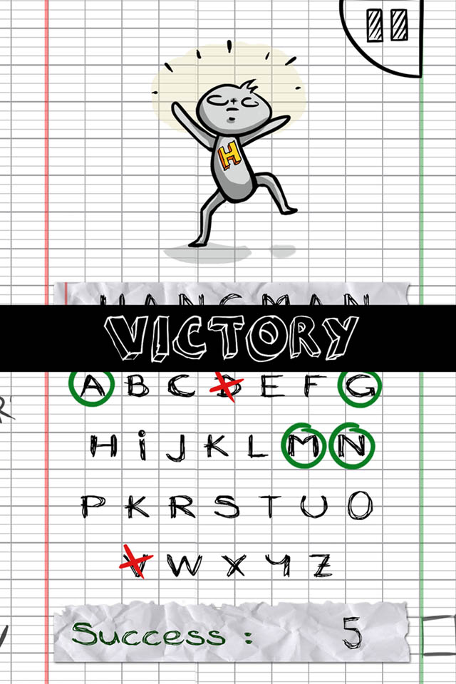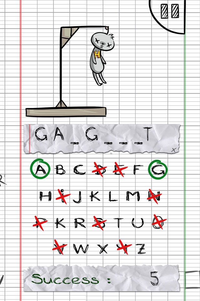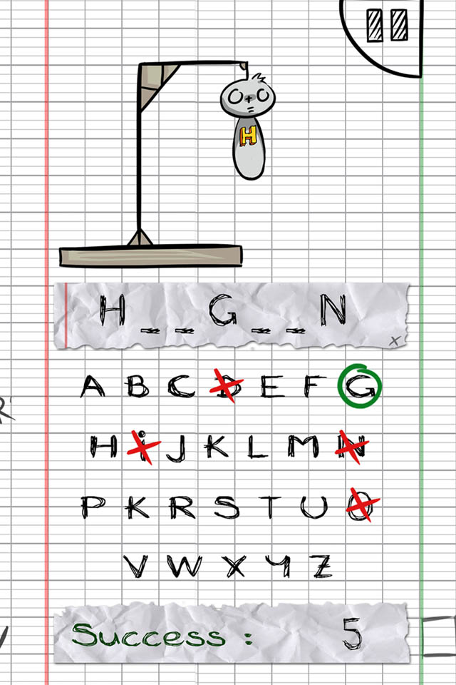You’ve got five minutes in the subway but you don’t know what you should do to occupy your hands? You like doodles, scrawls and you’re a huge fan of the game of the Hangman? If that’s the case, you stopped at the exact right place! The Hangman Game: Scrawls is an adaptation of a great classic game supported by the presence of the little Hangman whose adorable expression are going to put a smile on your face! You should seriously play it! In case you went for a vacation on Mars the last two centuries, here’s a brief recap of the rules. You must find a hidden word about which you only know the number of letters. At each turn, you must choose a letter that you think is in the word. If you’re right, the letter appears in the word but if you’re wrong, you lose a live. Make too many mistakes and it’s game over! Enjoy this adaptation and it’s three difficulty mode that will hook you during your trips in the subway! CARACTERISTICS - 3 Difficulty settings - 300 stars to collect - Best Score - Touch the screen to choose a letter