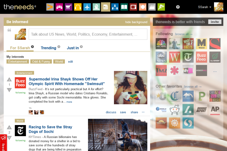 Theneeds brings you the web you need & love tailored to your interests, in one beautiful social place. Discover the news, videos, music, social posts, you need, curated just for you. Tell us what you like, and our technology will do the rest, surfacing the most relevant online content from top sites (such as The NYTimes, CNN, The Huffington Post, Twitter, YouTube, BuzzFeed, …), cool blogs, and from people just like you. Theneeds’ technology combines advanced Artificial Intelligence, a community-based voting system, and expert curation to deliver the web that matters to you. ** DISCOVER THE BEST OF THE WEB BASED ON YOUR INTERESTS Theneeds is your personalized web discovery app, pairing its unique web know-how with your specific needs & interests. ** THENEEDS SCOURS THE WEB SO YOU DON'T HAVE TO Theneeds collects and analyzes millions of news articles, tweets, videos, and more from thousands of services. We know what's hot on the web. ** THENEEDS CONSTANTLY LEARNS ABOUT YOUR INTERESTS When you vote, read, share, etc. Theneeds builds your digital interest DNA. The more you use it, the smarter it gets at satisfying all your web needs. ** THENEEDS IS COMMUNITY-POWERED AND SOCIAL Individuals are best at curating what matters most - vote on what you like to help surface the best, for more quality and less noise. App features: - Get the best of the web tailored to your needs & interests and discover news, videos, tweets, and more. - Sign up and tell us what you like by selecting your interests (you can always change them later). - Explore different Needs (like News, Travel, Music, Sports, Money, and more). - Browse your Need streams and vote on what you see to help us bring you more of the web you need and curate together what matters most. - Connect your social network accounts, Facebook, Twitter, and share easily with your network. Download Theneeds and get started! Theneeds is the best personalized news app. Discover content tailored to your needs & interests from sources like NYTimes, CNN, NBC, WSJ, Yahoo, FT, theCHIVE, FOX, BuzzFeed, ABC, BBC, LATimes, NPR, WP, NYP, CBS, CNBC, Twitter, FB. Think Flipboard meets Pandora. To learn more, check out our website http://www.theneeds.com and follow us on Twitter @theneeds and on Facebook. For any questions or technical issues, send us an email to [email protected] and we’ll help you get going.