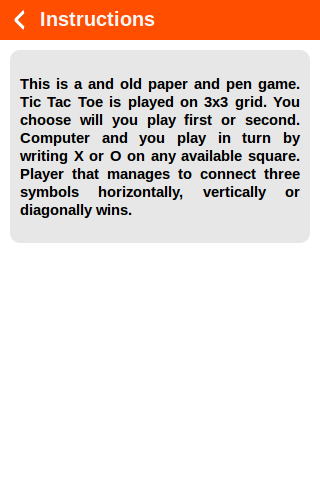 This is a HTML5 implementation of and old paper and pen game. Tic Tac Toe is played on 3x3 grid. Two players play in turn by writing X or O on any available square. Player that manages to connect three symbols horizontally, vertically or diagonally wins.