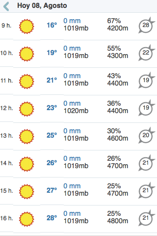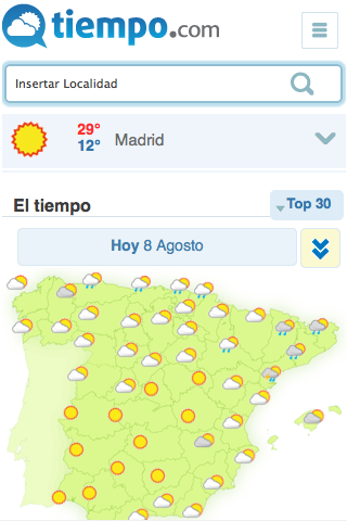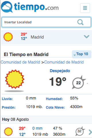 La aplicación permite consultar la predicción de el tiempo para más de 20.000 localidades de España y 200.000 de todo el mundo. Predicción para las estaciones de Esquí. Widget de El tiempo, para ver directamente en la pantalla del movil la predicción de su ciudad. También pueden consultarse mapas meteorológicos de lluvia, temperaturas, presión, etc. Al igual que se ofrecen las alertas meteorológicas de la Aemet. También permite la colocación de un widget en el escritorio.