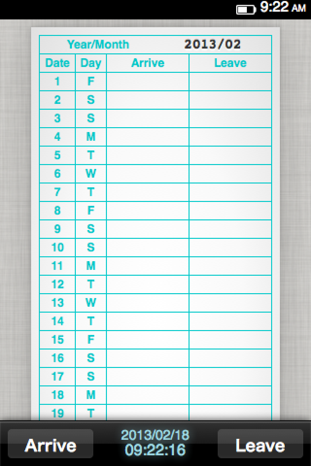 Simple time recorder application. It's also available offline. Please use to record your working hours. It adjusts time with Japanese standard time server automatically and periodically, so it records exact time even if the device clock is wrong. The server is in Japan, but this feature is available both in and out of Japanese time zone. Overview