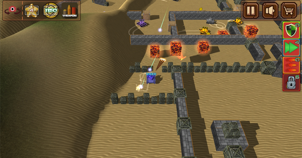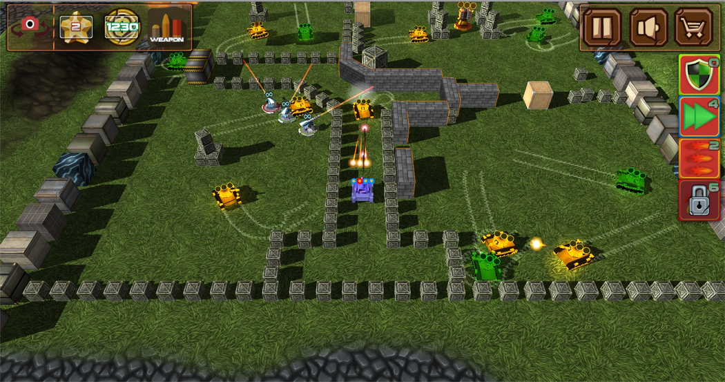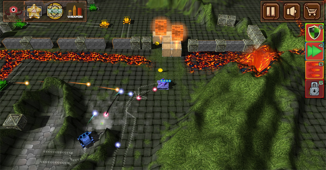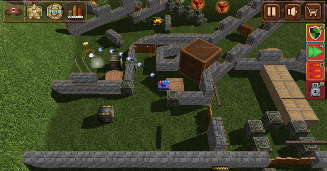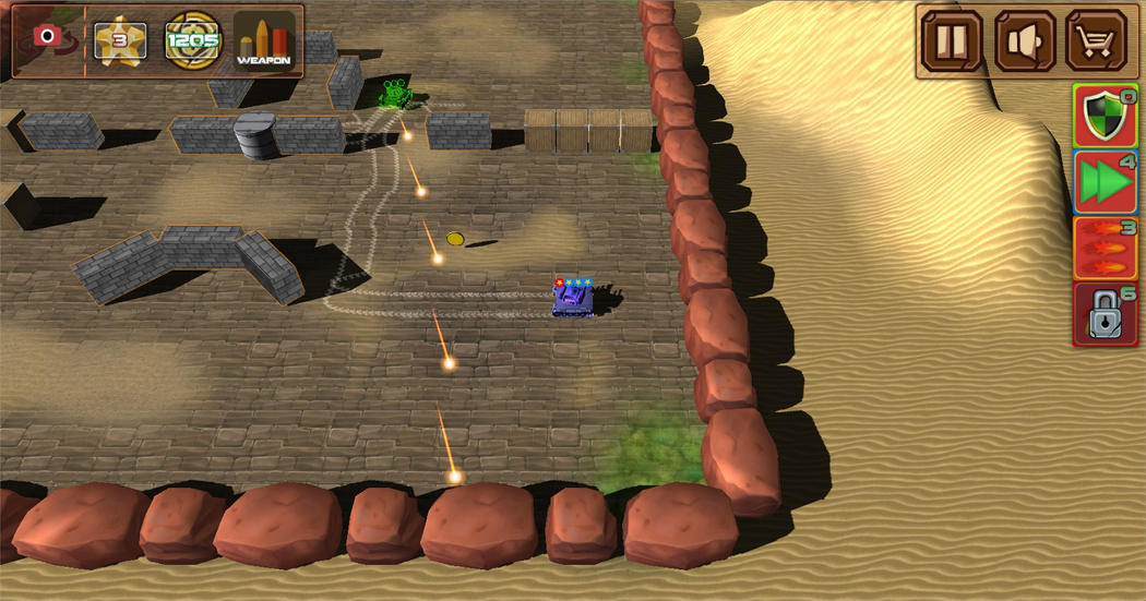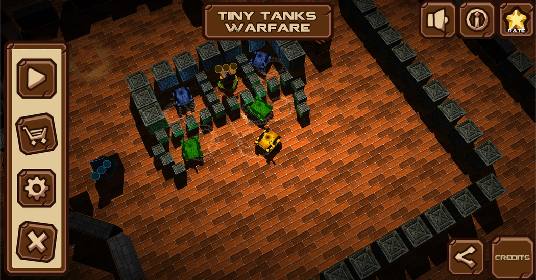 Change input settings in the options menu. To Control Your tank you can use the following inputs: -touch screen (on screen joystick to move and tap to shoot) -Pc/Mac with keyboard (WASD to move tank and click mouse to shoot) 100 Levels of "tiny tank" warfare, defeat enemy tanks using brute force and tactics. Earn power ups to progress through 4 different worlds where you finish your journey in space... for now. Your mission is simple, reclaim lost ground from enemy "tanks" and retake the treasures they have stolen and boxed up from our towns and villages. -Challenging enemies with multiple weapons and power ups. -Destroy enemy tanks and installations to get upgrades -Fight through 4 dynamic worlds avoiding deadly obstacles. -Keep all lives to earn extra street Cred... I mean "tank" upgrades. Upgrade your tanks by unlocking new weapons, boosters and power-ups, to help you defeat increasingly challenging enemies and obstacles, that require timing, precision and speed. Change graphics level to suit the processing power of your device. Destroy all enemy tanks to progress through each level. Tap the screen at any point and your tank will shoot in that direction. Watch out for enemy tanks as the difficulty increases as you progress through 100 levels. Battle against an evil army of tanks that have laid waste to our world. Upgrade your tank to improve its defences and attack capabilities.
