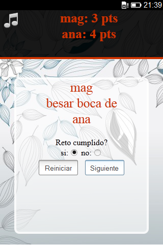 un divertido y sencillo juego para pasar un rato en pareja. un reto aleatorio con acciones y partes del cuerpo. el primero que llegue a 15 pts gana