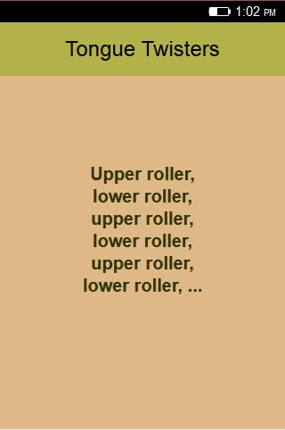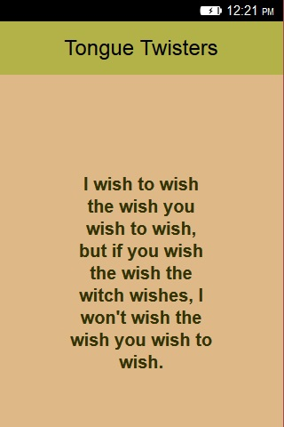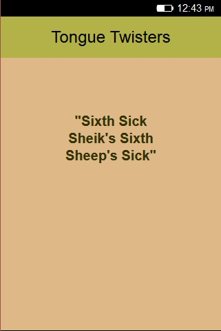 Here comes the Ultimate Tongue twisters for you...Have Fun... ✪In this we have come up with the most amazing and Ultimate Tongue Twisters. ✪There are about 50 plus Tongue Twisters in this App. ✪Tongue twisters are not only a linguistic fun and game but serve a practical purpose for language and speech development. ✪ This is totally a FREE APP. # If you like any Tongue Twister from this app you can simply tap on the text and you will get share options then you can share with your friends n family or even email it.