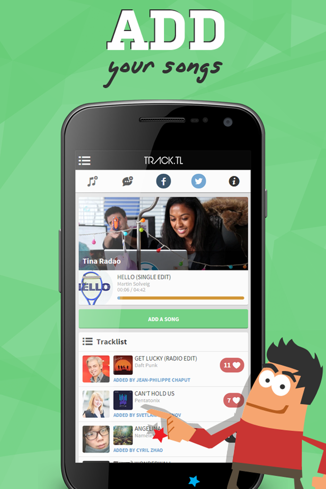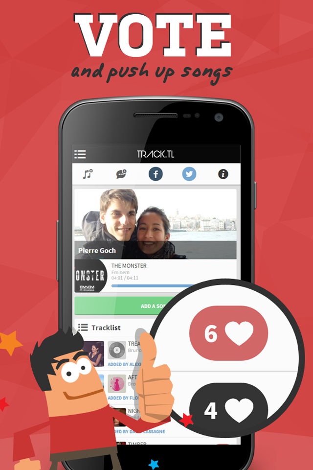 :: That is the Best App for your parties ! :: Tracktl gives people live control over the music in every parties (or events) ! Create your own Trackparty and invite your friends. They can add and vote for their favorite songs directly from their smartphones. Most voted tracks are the first to be played : it's an Epic Democratic Music - wait for it ... - Battle ! Tracktl takes your parties to another level of Fun and Interactivity with your friends. Tracktl has already been used in private parties, Bars, before concerts, on the radio, BIG students parties, Festivals, coworking spaces, offices, promotional events, shops, meetups, weddings etc... and soon in stadiums for the half-time of your favorite game ! Tracktl allows you to : - Create collaborative playlist, - Invite your friends to join your playlist, - Add your favorite songs from a library of 40 millions songs, - Vote for your favorite songs to push them up in the Tracklist, - Post messages to your friends on the Party Wall, - Have Fun (not optional)