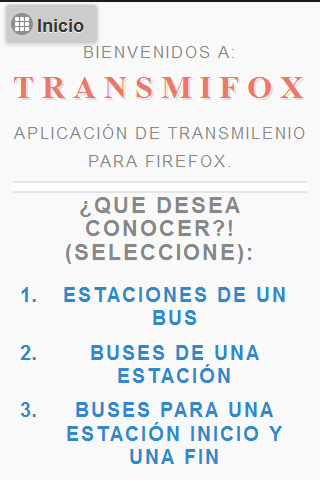 Bienvenidos a la pagina web representativa de la aplicación móvil para Transmilenio para el Sistema Operativo Firefox. Ya que la aplicación esta en una versión todavía inicial, les ruego por favor envíen todos sus comentarios a través de este medio, intentare en la mayor brevedad ajustarla y morar su usabilidad. Recuerden que en la pantalla inicial, pueden verificar cual es la versión actual en el FireFox Market (con el botón de verificar versión) y comparan con la versión que tengan instalada. Muchas gracias por usarla y espero les sea de bastante utilidad como lo ha sido para mi !!. William Altuzarra Noriega