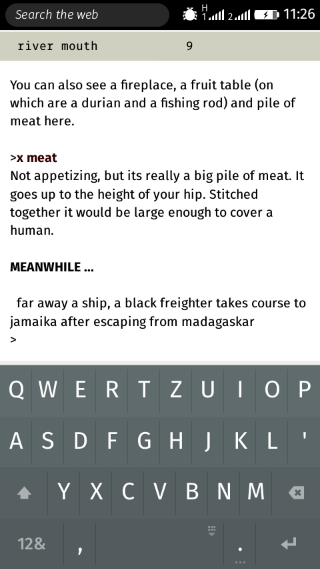 "the secret of smiley island" is a textadventure or interactive fiction written with inform7. It used the inform7 built-in mechanism to publish it as a website and I customized it to an open web app thats using appcache for offline play. so the commands "save" and "restore" are working offline also. Both the app and the story source text are available at github. https://github.com/nebocamin/tsosi-app The story will end after the first act and will evolve in later releases. the next release of the adventure is scheduled for february 10th. the final result should be ready within a certain amount of time after the next fosdem.org