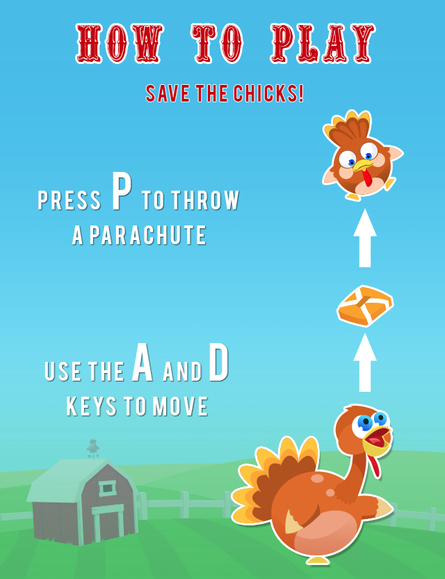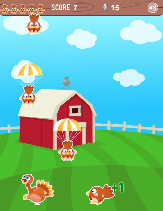 Gobble gobble! Baby turkeys are falling from the sky and need help! Get under them, toss them a parachute, and watch them float to safety. Make sure you are efficient, as the little gobblers will start falling faster and faster as the game progresses. Don't let them tumble!