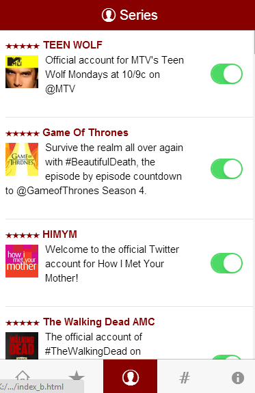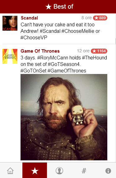 Recent tweets from the best tv series ► Tv Series Tweet The recent tweets by the most popular tv series! - Follow them, you don't need a Twitter account - Emphasis on words & images (retweets & replies are cut) ► Always fresh View the most shared recent tweets, along with their shares count. - Touch a tweet to instantly share it with your contacts. ► Update & Focus View and select the list of the leading and most active Tv Series on Twitter - See the series actual influence value (changes day by day) - Touch the Tv Series to read its best tweets, turn it off to hide its tweets. ► Follow the Trend View the best hashtags and the most used words on Twitter by Tv Series accounts ► Lots of Tv Series Featuring the best Tv Series, including: House of Cards, Game Of Thrones, Da Vinci's Demons, Cosmos, How I met your mother, The Big Bang Theory, Hannibal, Orange Is the New Black, The Following, Helix, Teen Wolf, Scandal, Once: Wonderland, The Walking Dead, The Tomorrow People, Breaking Bad, 2 Broke Girls, Under The Dome, Black Sails, Brooklyn Nine-Nine, Almost Human, Masters of Sex, True Detective, The Killing, American Horror Story, Awkward, Glee, Pretty Little Liars, The Vampire Diaries, Falling Skies, True Blood etc.