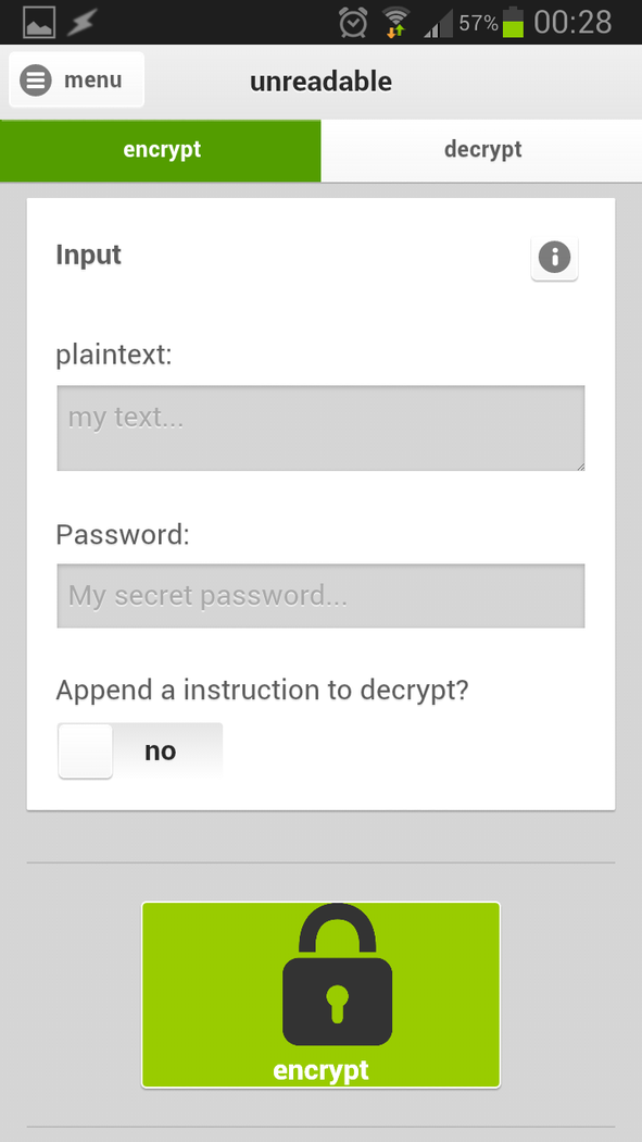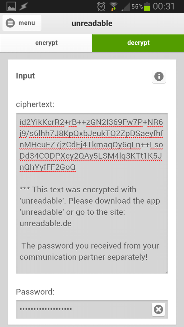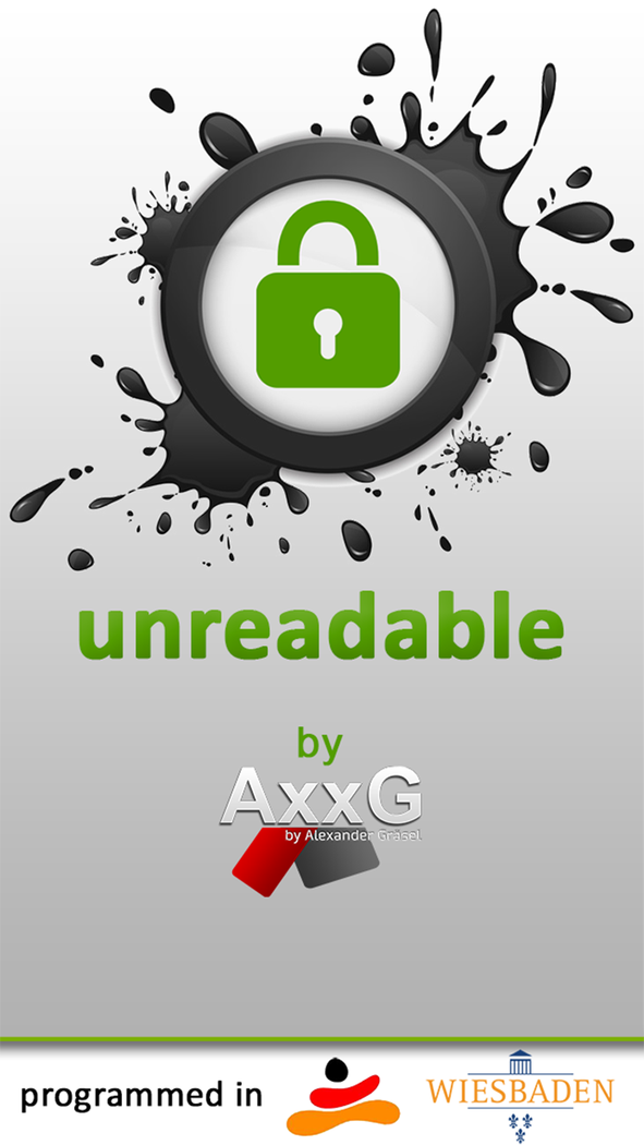 unreadable - the name says it all:) Through various horror reports in the media, such as PRISM (the NSA spying program, USA) or Tempora(the GCHQ spy program, UK), my confidence in the digital communication became more and more insecure. So I asked myself: can everybody read my emails like a postcard or follow my chat on facebook? There are so many different services (De-Mail, hike, etc.) that promise: security, confidentiality and privacy. But all services have one thing in common, the texts and keys are stored on servers on the Internet. So my data are not safe and non-locally or offline available. In addition, any of my friends / communication partner must be logged in to the service. For these reasons I wrote the unreadable-app. It encrypts and decrypts text independently of the transport (e-mail, Whatsapp, Facebook and co) and the platform (PC, smartphone, television, etc.). Other functions are: