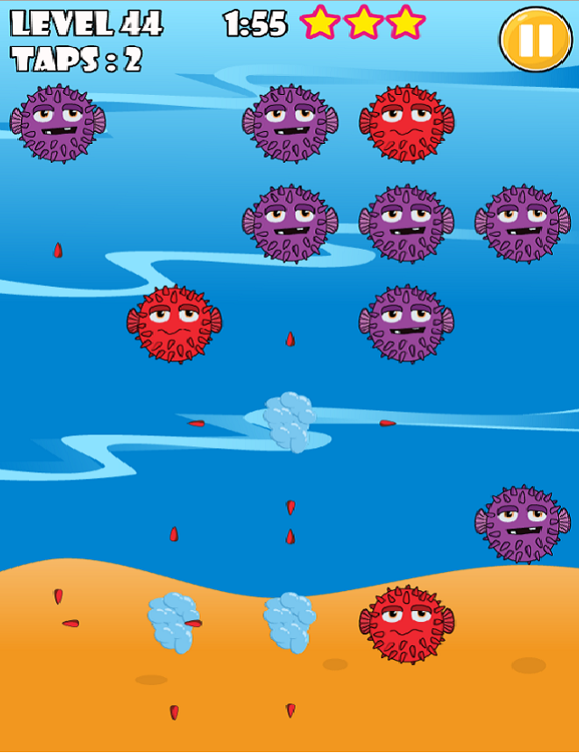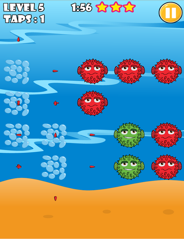 The urchins want to explode, so give them what they want! Tap on the urchins to explode them and watch a fantastic chain reaction as nearby urchins also explode. Win by exploding all the urchins in the given moves before time runs out. Want 3 stars? You'll need to be extra fast!
