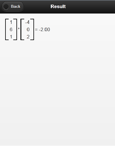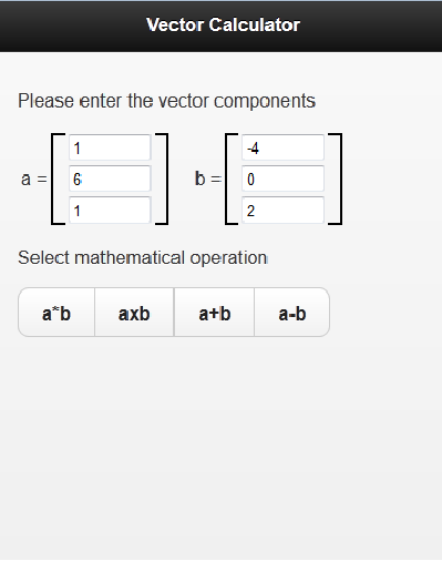 The app calculates the dot product, the cross product, the sum and the difference of two vectors in 3-dimensional space.