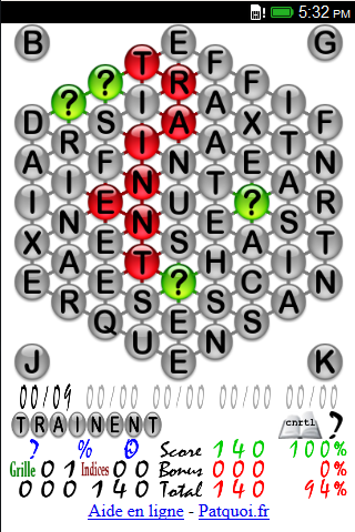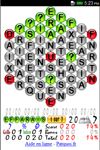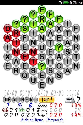 Jeu de mots mêlés dans une grille hexagonale. Chaque lettre n'est utilisée que dans un seul mot et une seule fois. Vous devez trouver 7 mots de 8 lettres cachés dans la grille, commençant dans les coins ou au centre. Les lettres doivent être reliées entre elles et chaque lettre ne doit être utilisée que dans un seul mot et une seule fois. Une fois trouvés tous les mots d'une grille et avant de passer à la suivante, vous avez un fil rouge dans lequel vous pouvez chercher 5 mots de 7 à 12 lettres en choisissant l'initiale. Chaque grille est générée aléatoirement grâce à un dictionnaire d'environ 45 000 mots permettant un nombre quasi illimité de possibilités.