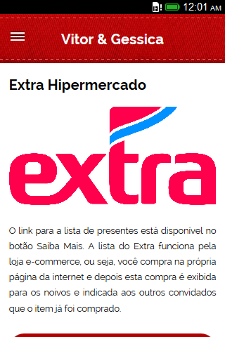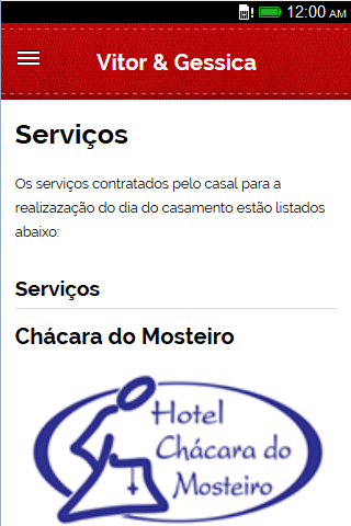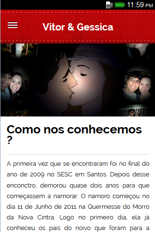 O aplicativo sobre casamento de Vitor e Gessica. Como se conheceram, as lista de presentes para os convidados, formulário de contato e os serviços contratados para o casamento.