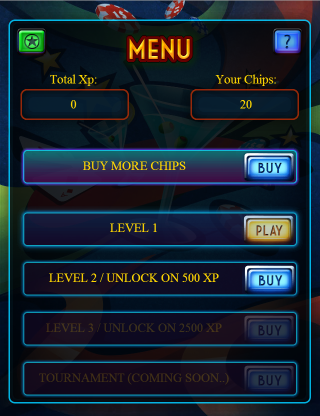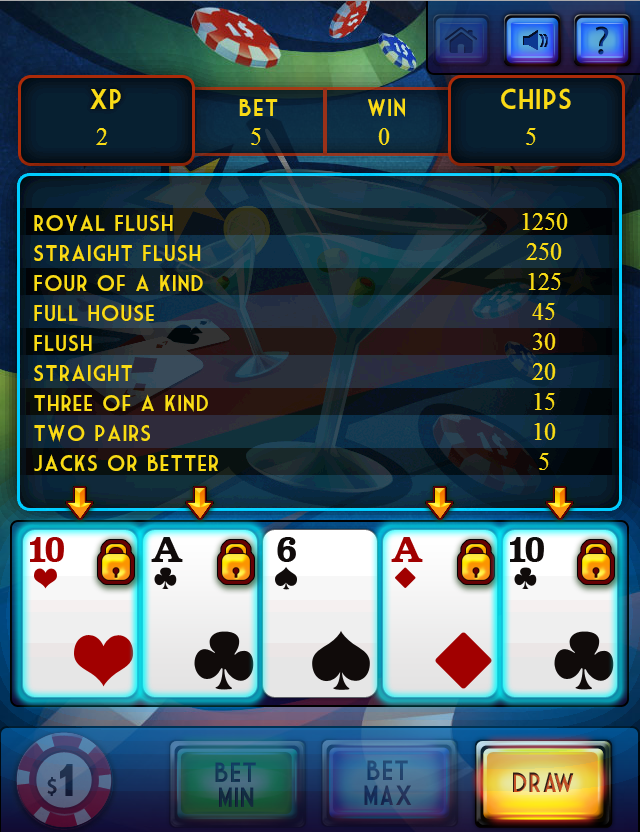 Welcome to Video Poker Party! Make your bet and compete in this multi-level, five-card draw poker game. Look for high hand combinations; a Royal Flush might appear in any round! The better you play, the more chips you'll earn! The more often you play, the more "Experience Points" you'll earn, giving you access to classier tables. Good Luck!