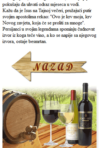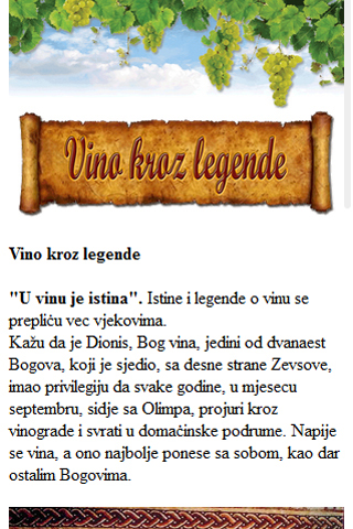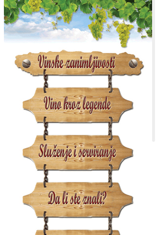 The application "Wine interesting" is designed to provide some information related to wine as "Wine through legends", "How to properly serve and serving wine", "How wine affects health", "Wine curiosities" ... In the application is listed some popular Montenegrin wines. Each wine is followed with photos and short text about wine. Also, explained the temperature at which wine is served and how it is served in the best way. The application includes a lot of interesting articles and photos that follow the subject. It is very easy to navigate. Aplikacija "Vinske zanimljivosti" je osmišljena da pruži neke informacije koje su vezane za vino kao što su: "Vino kroz legende", "Kako se pravilno služi i servira vino", "Kako vino utiče na zdravlje", "Vinske zanimljivosti" i slično. U aplikaciji su nabrojana i neka najpopularnija Crnogorska vina. Svako vino prati fotografija i kratki tekst o tome kakvo je vino, na kojoj se temperaturi služi i sa čim se najbolje servira. Aplikacija obuhvata dosta interesantnih tekstova i fotografija koje prate zadatu temu. Veoma je laka za navigaciju.