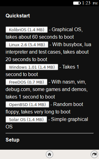 is a prototype virtual x86 emulator 32 bit processors (x86) with several preloaded systems. KolibriOS Linux 2.6 Windows 1 freeDOS OpenBSD Solar OS