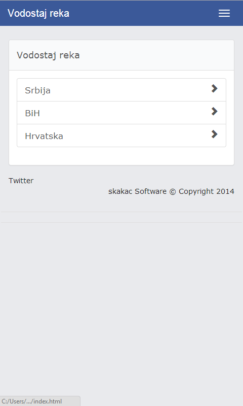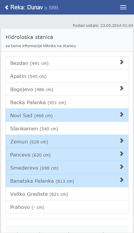 Novo! - Povecana rezolucija, ubacena slika stanje nivoa u profilu - Dodata provera vodostaja reka i za BiH i Hrvatsku Proverite vodostaj svih reka u Srbiji, BiH i Hrvatskoj. Ova aplikacija je napravljena kako bi u svakom trenutku mogli da saznate vodostaj bilo koje reke, bilo gde. Upustvo: - Izaberite drzavu - Izaberite reku - Izaberite stanicu Infromacije su uvek tacnije kod 48h-og prikaza. Broj reka: - Srbija 40 - BiH: 10 - Hrvatska 92 Izvor informacija: za Srbiju - Republicki Hidrometeoroloski zavod Srbije za BiH - Republicki hidrometeoroloski zavod za Hrvatsku - Hrvatske vode