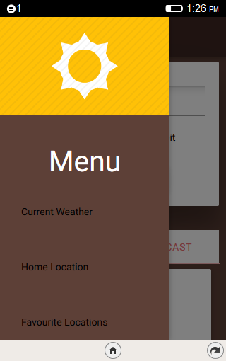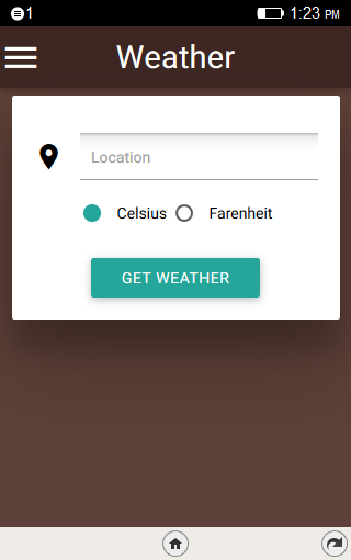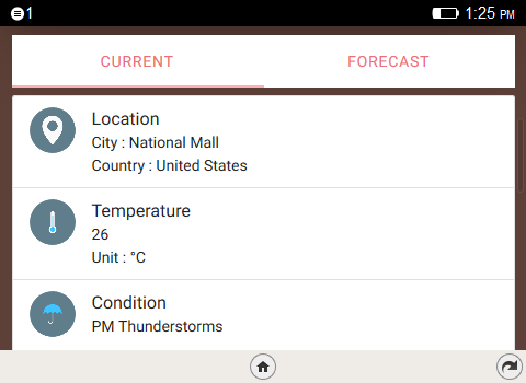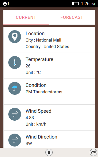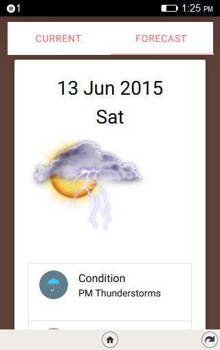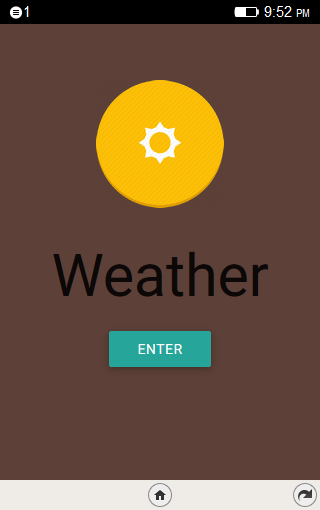 NOTE: The app is in beta and many functions are still being implemented on the go. If you want a certain feature, feel free to leave a comment. Also, please note that Firefox Marketplace does not have any way to reply to your reviews. So, if you have a problem or a bug report, feel free to mail me at "[email protected]". ---------------------------------------------------------------------------------------------- A simple, beautiful and elegant weather app. Just type your location and get detailed data in a gorgeous look. -Current weather -5 day weather forecast - Design inspired by Material Design - 7 In-built themes to choose from. More functions coming soon. Upcoming update : Geolocation ETA : Soon. ---------------------------------------------------------------------------------------------- Changelog : 0.5.0 - Design changes : Now input your location more easily! -New feature : 5-Day Weather Forecast (yeah! :D ) -Minor bug squishing 0.4.0 Something new here! -New design elements added! Check out the cool slide-out navigation system. -New settings page. Customize your experience. -New "App Theme" chooser! Personalize your experience. -Minor bug squishing. -Code cleanup. Less messy now. :) 0.3.0 Added new design elements! -A brand new slide-out bar! Functions added in the future can be easily accessed from here. -Repositioning of the main page elements. Makes more sense now. -Context sensitive feedback depending on the state of the app to the user for more user-friendly interface. 0.2.0 Design Overhaul! -New beautiful and elegant redesign with soft colours -Added more details regarding the weather conditions -Some minor bug squishing 0.1.0 Basic weather app.