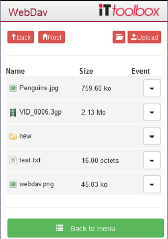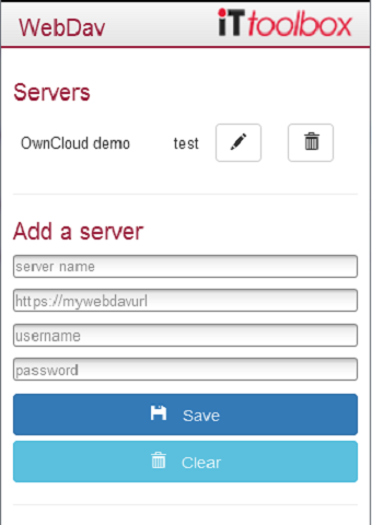 Webdav ITTB is a webdav client for Firefox OS. It allows you to manage your webdav server directly on your device, you can also upload local files to your server. It works with OwnCloud, CloudMe, and many others webdav server.