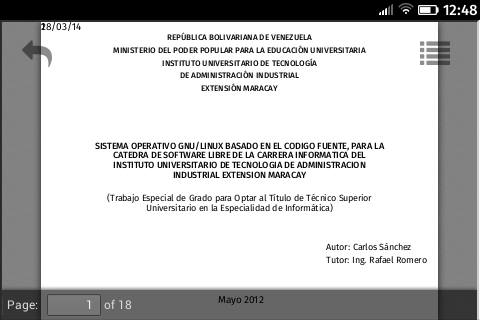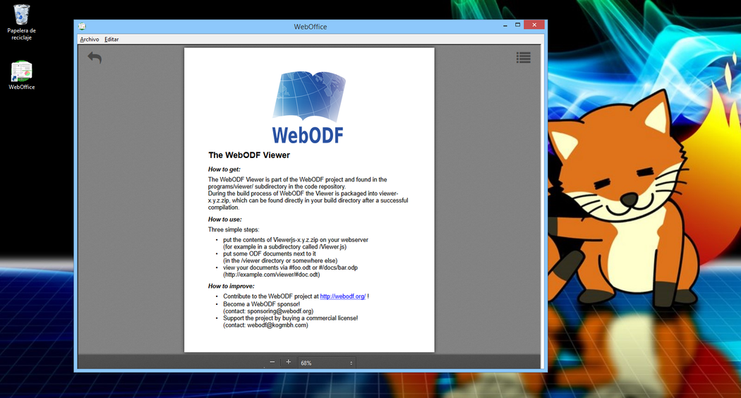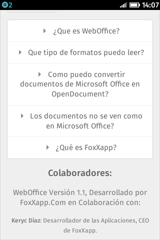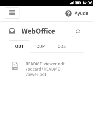 Les presento la aplicación LibreOffice de FirefoxOS llamada ODF Viewer. Es una aplicación para Firefox OS que te permite leer cualquier archivo en formato OpenDocument almacenado en la memoria SD de tu dispositivo. OpenDocument es un formato de archivo abierto y estándar para el almacenamiento de documentos ofimáticos tales como hojas de cálculo, textos, gráficas y presentaciones. Los Documentos soportados son los que poseen las extensiones .odt para documentos de texto, .ods para hojas de cálculo, .odp para presentaciones. La aplicación de Microsoft Office, posee un sistema de conversión y guardado para convertir cualquier documento ya sea word, power point o excel en OpenDocument, pronto en futuras actualizaciones añadiremos un sistema para convertir documentos directo desde ODF Reader.