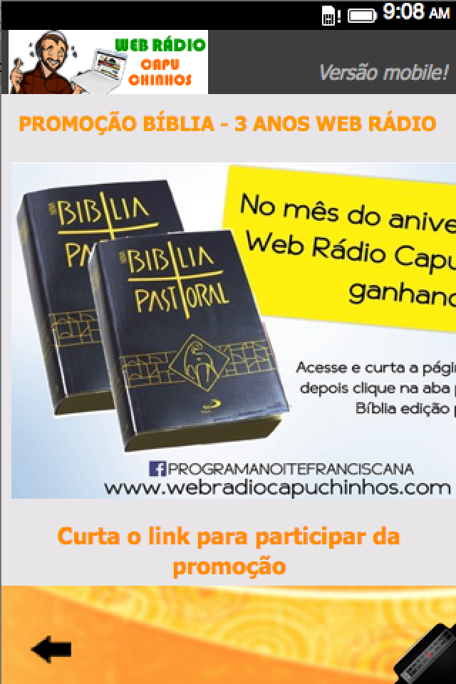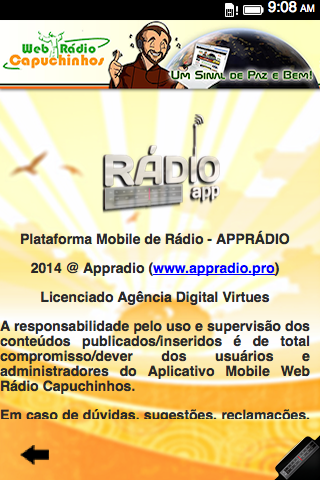 Agora você pode curtir a Web Rádio Capuchinhos no seu celular. A Rádio, tem uma programação que é sinal de Paz e Bem. Participe e interaja com a nossa Web Rádio, baixe o nosso aplicativo para curtir toda a nossa programação e fazer parte da nossa família. Acesse ao nosso endereço - webradiocapuchinhos.com Curta nossa página - www.facebook.com/webradiocap Entre em contato – [email protected] Site: http://webradiocapuchinhos.com/ keywords: WebRadio Capuchinhos , webradio, radio, Capuchinhos, capuchinhos , radio brasileira , radio do brasil , radio capuchinhos , aplicativo de radio , radio app , appradio , aplicativo de musica , music app. Mobile Radio App (www.appradio.pro).