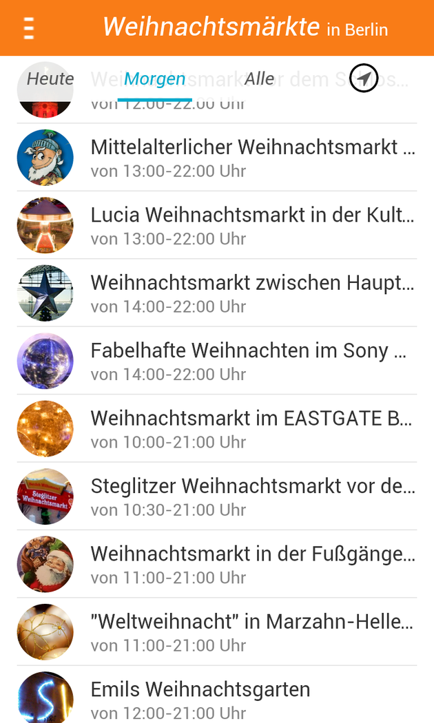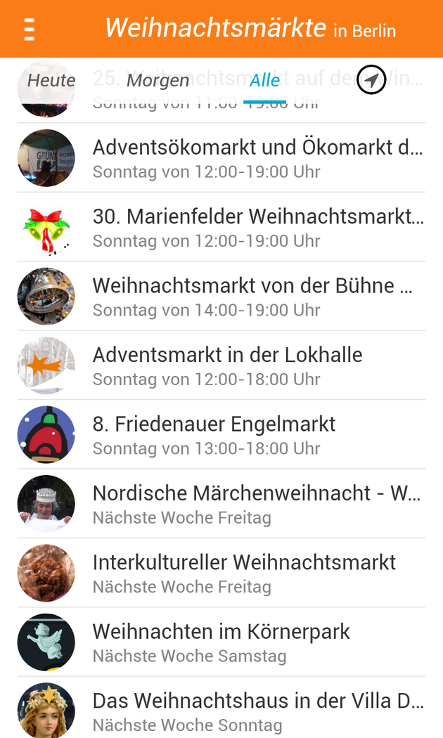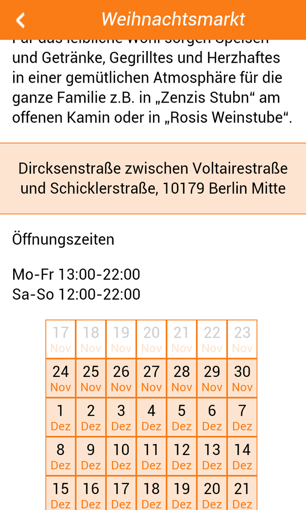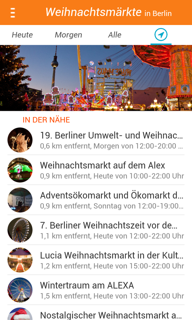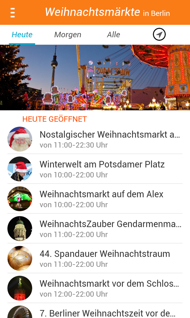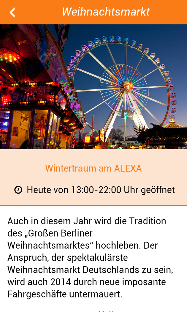 Finde alle Weihnachtsmärkte in Berlin: die großen, die kleinen, die bunten, die lebhaften, die besinnlichen und die Geheimtipps. Alle in einer App. Erlebe eine entspannte Weihnachtszeit und lass dich nicht von der Hektik der Stadt anstecken. Entdecke deinen bekannten Weihnachtsmarkt neu oder entdecke deinen neuen Liebling. Egal, ob du lieber die bunten Fahrgeschäfte suchen oder auf die besinnlichen kirchlichen Märkte willst - finde in der App über 80 Märkte mit allen wichtigen Informationen, wie z.B. ob sie nur an einem Adventssonntag geöffnet, oder aber ihre Pforten bis ins nächste Jahr geöffnet haben. Ich wünsche dir ein besinnliches Fest und einen guten Rutsch. Hast du Ideen, was man besser machen könnte? Dann schreib mir!