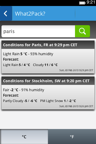 What2Pack allows you to quickly look up the weather in different locations and compare them - so you always know what to pack. Old searches are stored on the device.
