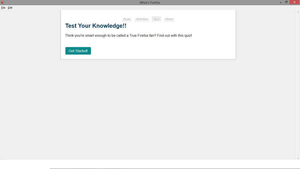 An app that helps you get familiar with Mozilla Firefox browser. #firefoxstudents This app has three different sections that engage the user Know- This section will help the users get familiar with the Mozilla Firefox browser, with it's history and its features Activities- This section contains a list of activities which are available for the user to perform, each activity help him understand better about Mozilla and Mozilla Firefox. Quiz- This is an interesting section which consists of five multiple choice questions, selected randomly from a set of ten questions, users will be evaluated and finally only a "True Fan" of Mozilla Firefox will be left standing. Source code-https://github.com/pkoli/WhatsFirefox