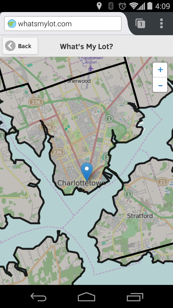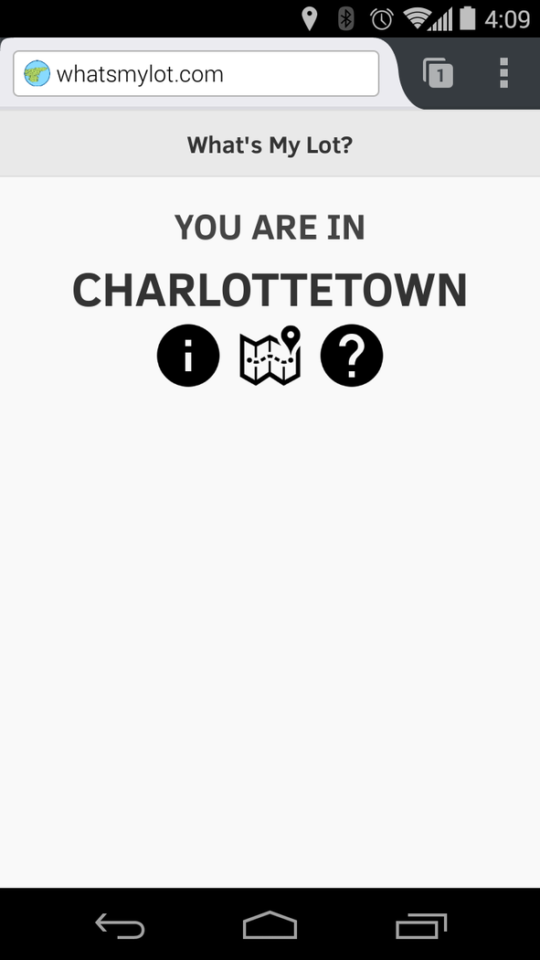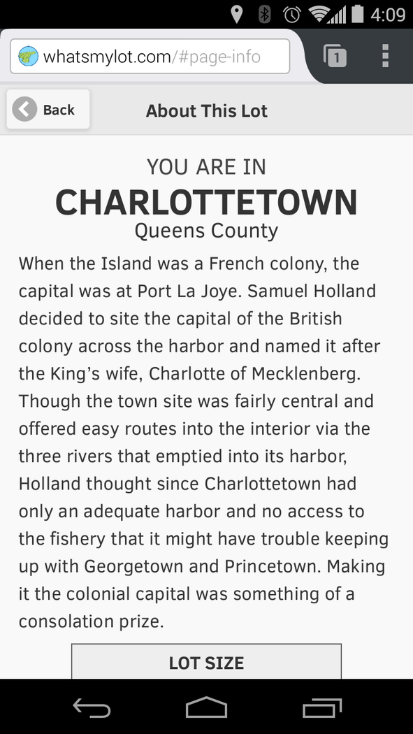 If you're on Prince Edward Island, Canada, this app uses the location of your device to calculate what lot (or "township") you're in. There are 67 lots and three "royalties" (Charlottetown, Georgetown and Princetown) originally laid out by Samuel Holland in 1765. While they are largely no longer in contemporary use, they are irrevocably imprinted on the Island landscape, through the shapes of roads and property lines. The app will look up your location, and either (a) display the number of the lot you're currently inside, (b) tell you it can't find your location or (c) tell you that you're not on Prince Edward Island (which might be true if, for example, you're on a beach or a bridge, all appearances to the contrary). As long as you have the app open, it will continue to update the lot number, so if you go for a drive in the countryside, you can watch it update as you cross lot lines. The app will also remember which lots you've visited, and will colour-code these in red on the map. On the information page about each lot you'll find the following information: